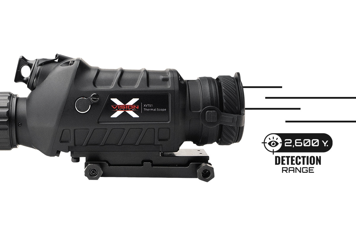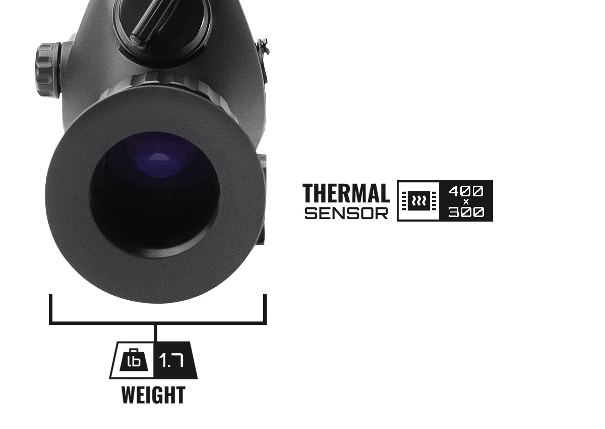 Bring the heat with the Impact 100 Thermal Scope’s 400 x 300 uncooled thermal sensor that can detect big game well past 2,000 yards.