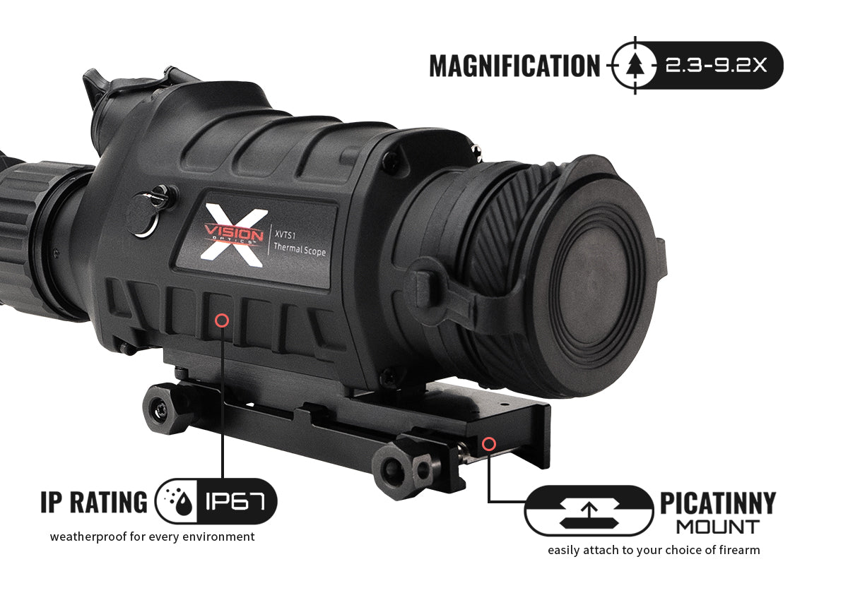 Temperature Variation Detection: 0.08ᵒ F Reticle Pattern: 10 Reticle Color: 2 Thermal Color Palettes: 6 Power Supply: Rechargeable 18650 Battery (incl.) IP Rating: IP67 Mount: Picatinny Dimensions: 9" x 3.5" x 3" Weight: 1.4lb